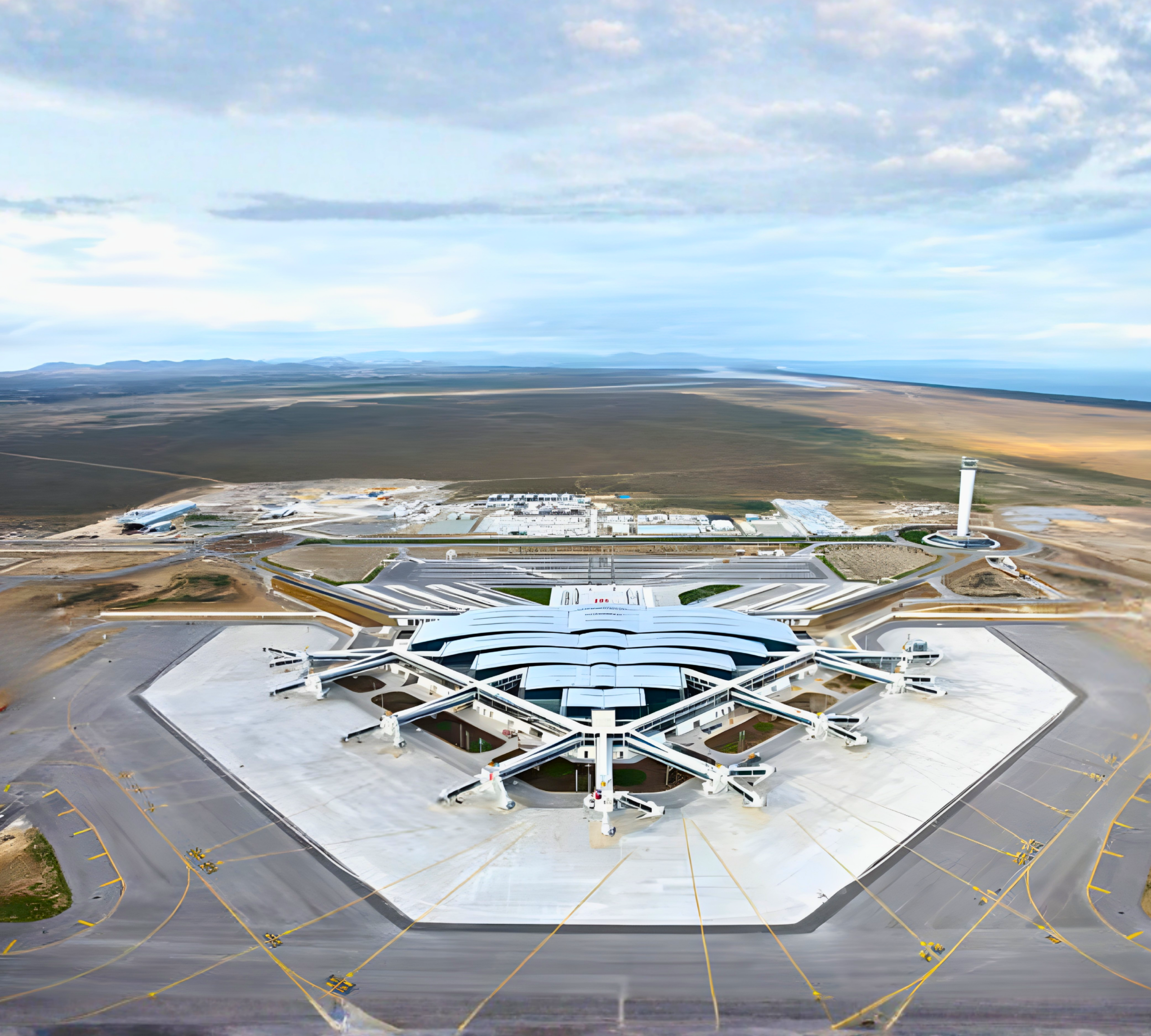 Mechanical works for the terminal, air traffic control, and auxiliary buildings. Mechanical systems, electrical installation works. Total indoor area 130,000 m².